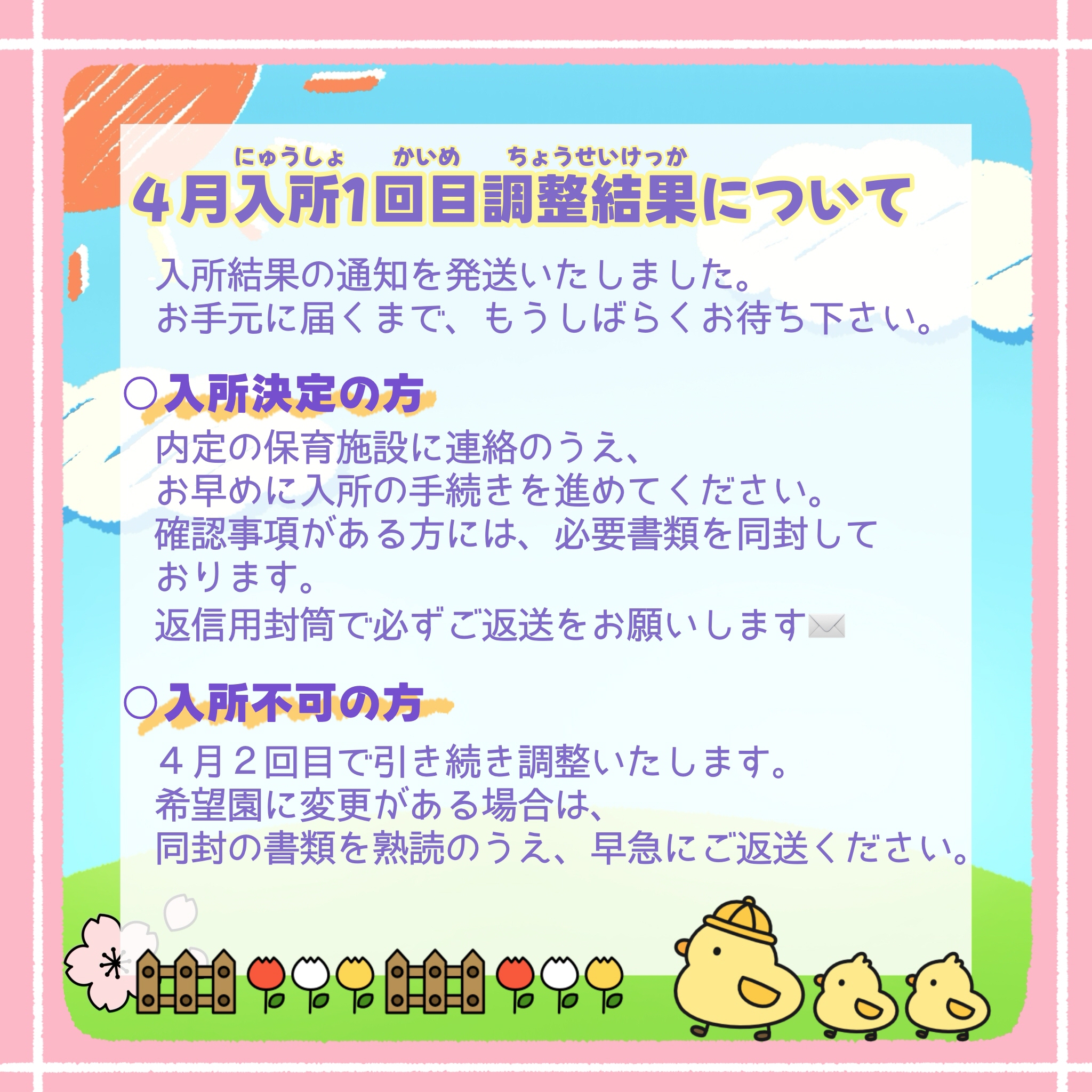 入所結果の通知を発送いたしました。